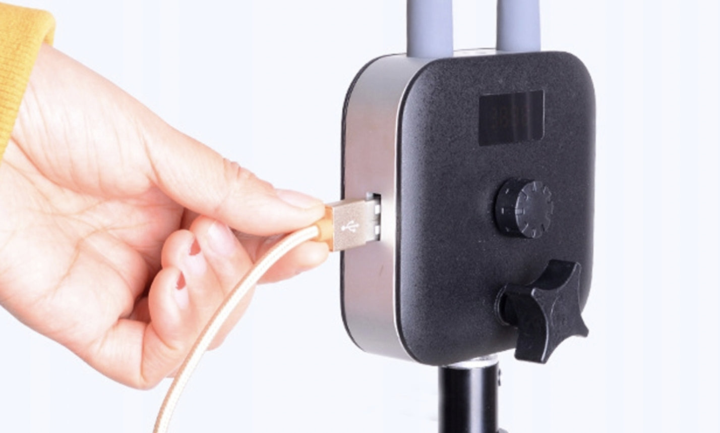 Lampa jest wyposażona w praktyczny port USB do ładowania smartfonów, co jest niezwykle wygodne podczas długich sesji pracy. Dodatkowo, uchwyt na telefon pozwala na łatwe tworzenie zawodowych zdjęć lub vlogów, co jest szczególnie użyteczne dla profesjonalistów chcących dokumentować i promować swoją pracę w mediach społecznościowych