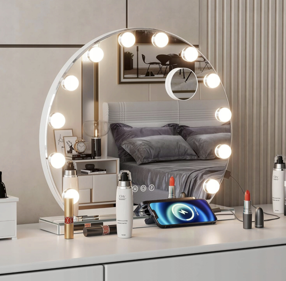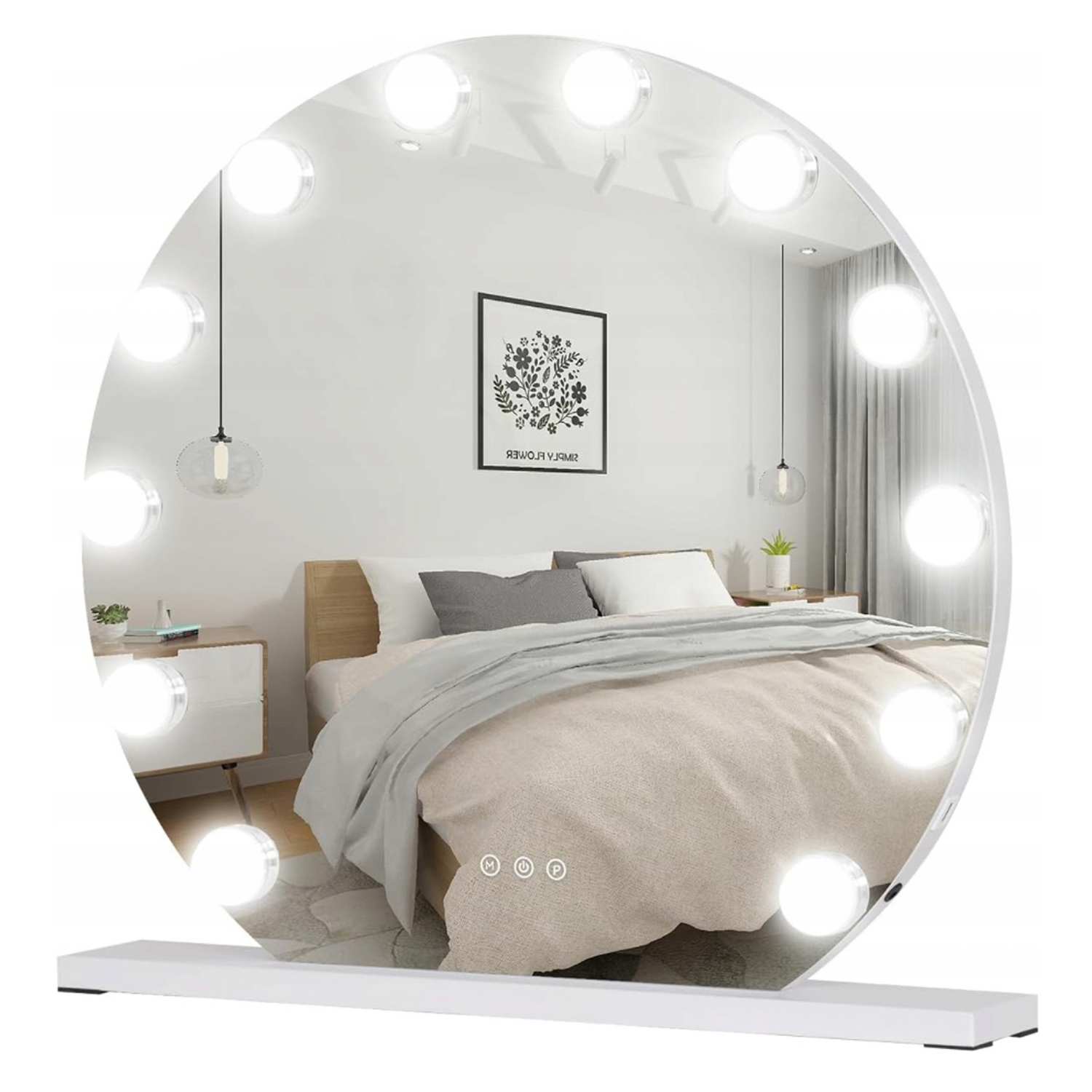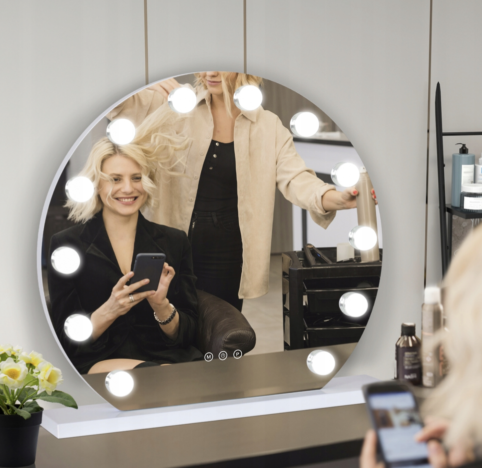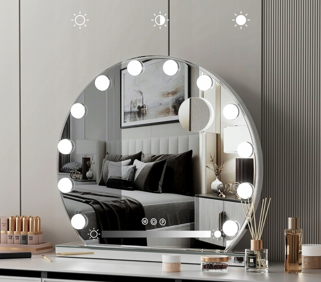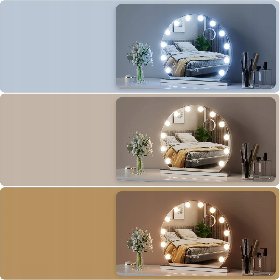 Lustro wyposażone w 12 żarówek LED oferuje regulowane oświetlenie w trzech wariantach: chłodny biały, żółty i neutralny. Zakres temperatury barwowej od 2500K do 6000K umożliwia idealne dopasowanie światła do różnych warunków, takich jak dzienne, wieczorne lub sztuczne oświetlenie, co ułatwia wykonanie perfekcyjnego makijażu