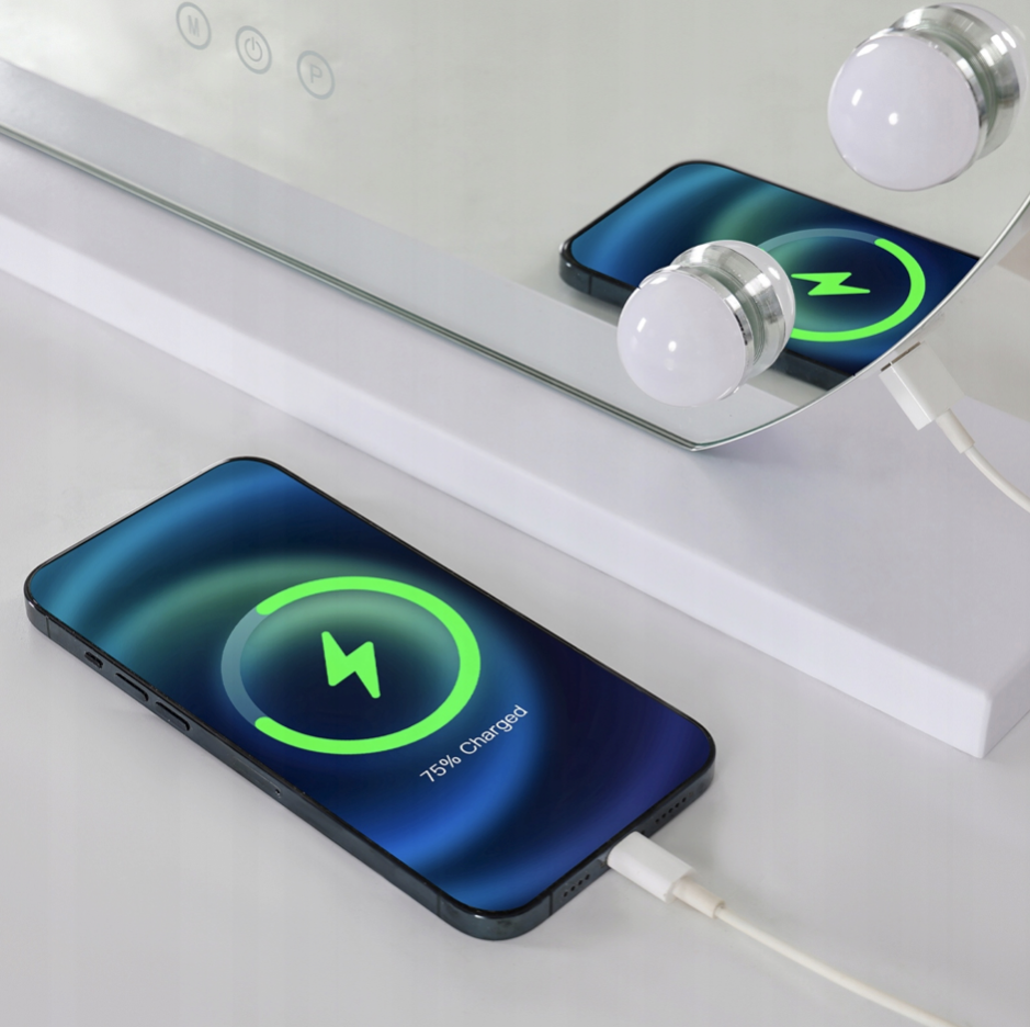 Lustro wystarczy wygodnie postawić na blacie i cieszyć się jego funkcjonalnością oraz estetyką. Wbudowany port USB i Typ C umożliwia ładowanie urządzeń mobilnych bez potrzeby korzystania z dodatkowych gniazdek. To praktyczne rozwiązanie idealne do codziennego użytku, które pozwala na wygodne korzystanie z telefonu czy innych urządzeń w czasie przygotowań